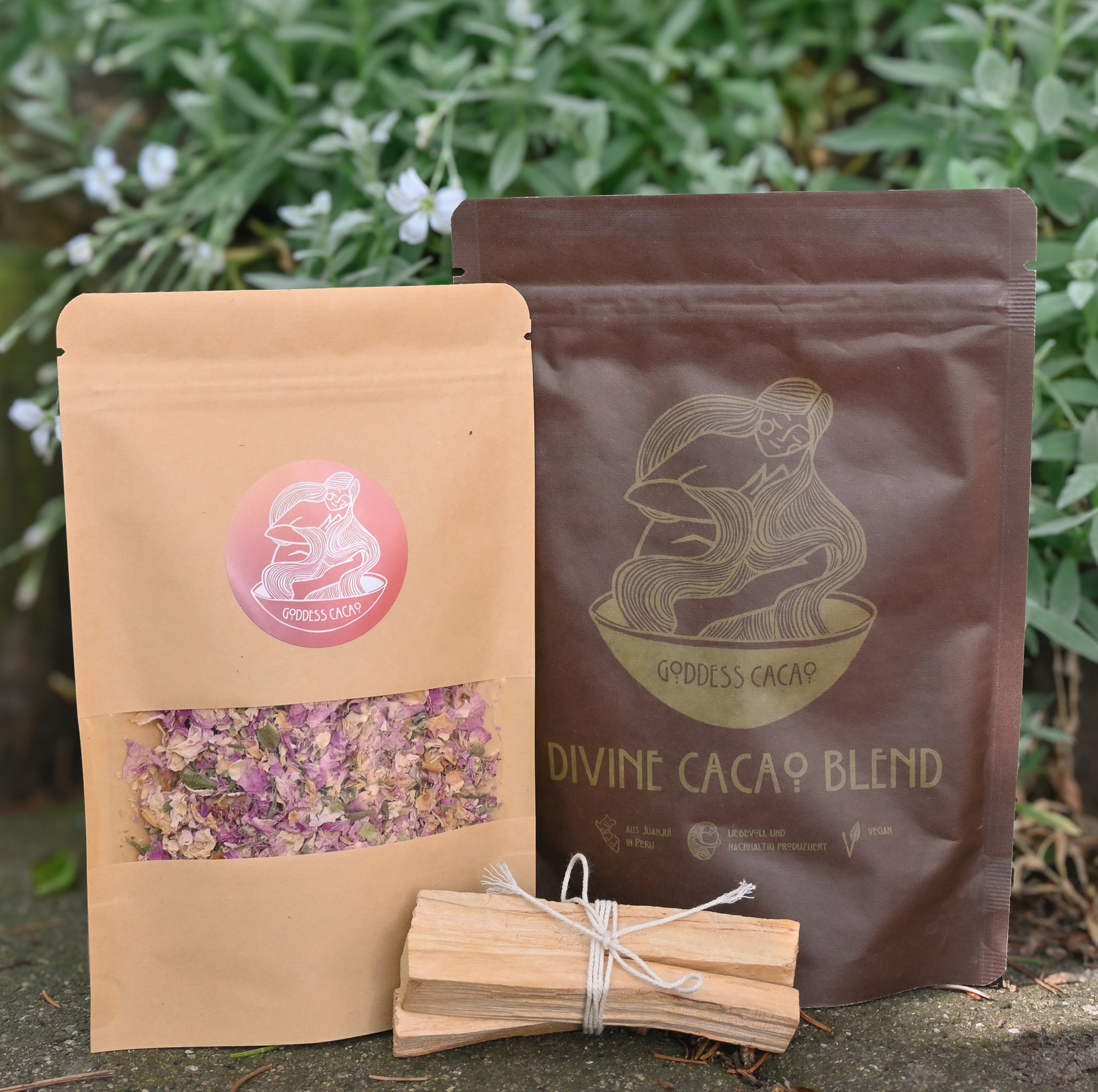Starte direkt in deine Zeremonie – mit dem Goddess Zeremonie Set. Erhalte zu deinem Kakao aromatische Rosenblätter und 3 Hölzchen reinen Palo Santo.